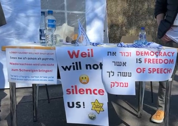 On 27.4.2025, the day of the ceremony, outside the entrance to the Bergen-Belsen site, we sat quietly at a small table, hanging banners in protest of the German attempt to silence the voice representing the Belsen survivors in Israel. Dr. Woiwode, the Lower Saxony government's head of ceremonies, the person who was the government's decision-maker, scurried around us like the hurrying rabbit from "Alice in Wonderland."
